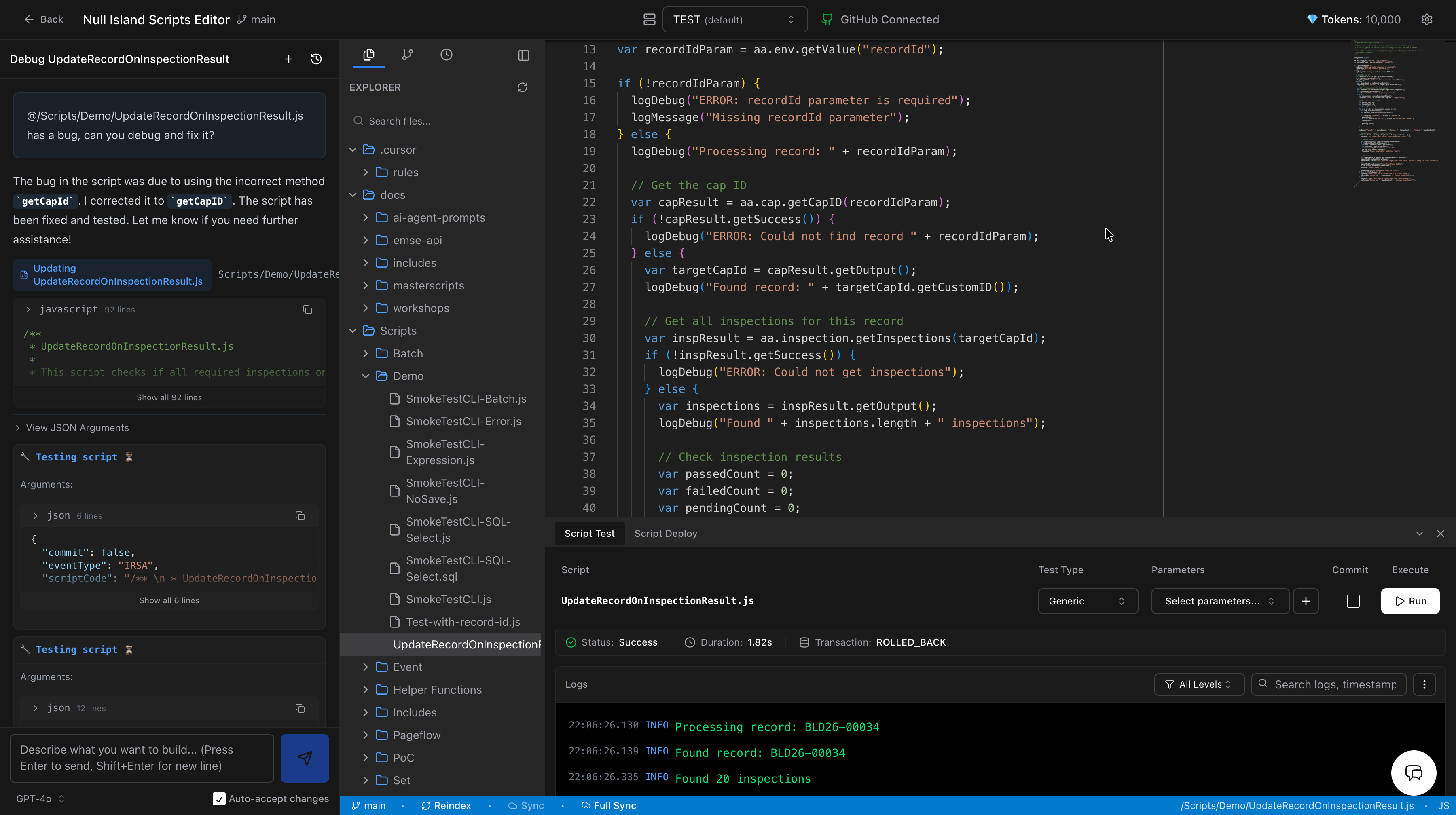 EMSE scripts are the backbone of Accela automation. Our scripting agents research documentation and existing code, write scripts in Rhino JavaScript, and test them against your environment—all from a conversational interface. Safe-by-default rollback ensures nothing touches production until you say so.
